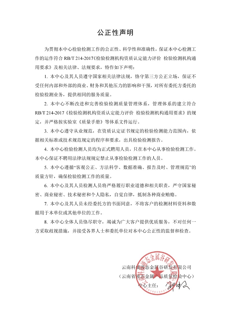中心以檢驗(yàn)檢測為核心業(yè)務(wù),以公共技術(shù)服務(wù)和科學(xué)技術(shù)創(chuàng)新為立足點(diǎn),以“客觀公正、方法科學(xué)、數(shù)據(jù)準(zhǔn)確、報(bào)告及時(shí)、管理規(guī)范”為方針,依靠高素質(zhì)的檢驗(yàn)檢測隊(duì)伍和管理團(tuán)隊(duì),采用先進(jìn)的分析測試技術(shù)和手段,開展液態(tài)金屬材料分析測試和產(chǎn)品檢驗(yàn)服務(wù)。