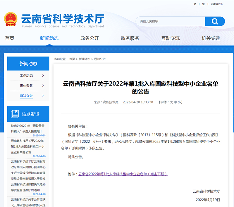 【概要描述】近日,云南省科學(xué)技術(shù)廳發(fā)布《云南省科技廳關(guān)于2022年第1批入庫國家科技型中小企業(yè)名單的公告》。根據(jù)《科技型中小企業(yè)評價辦法》(國科發(fā)政〔2017〕115號)和《科技型中小企業(yè)評價工作指引》(國科火字〔2022〕67號)要求,經(jīng)公示通過,現(xiàn)將云南省2022年第1批268家入庫國家科技型中小企業(yè)名單(詳見附件)予以公告。