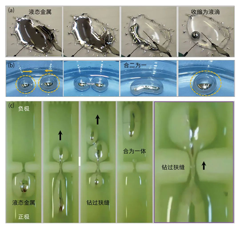 液態(tài)金屬大尺度變形與運(yùn)動(dòng) (a)一灘液態(tài)金屬收縮成為一滴金屬球;(b)兩滴液態(tài)金屬球融為一體;(c)液態(tài)金屬球在電場(chǎng)刺激下鉆過較自身狹窄多倍的狹縫,穿越后恢復(fù)原狀。