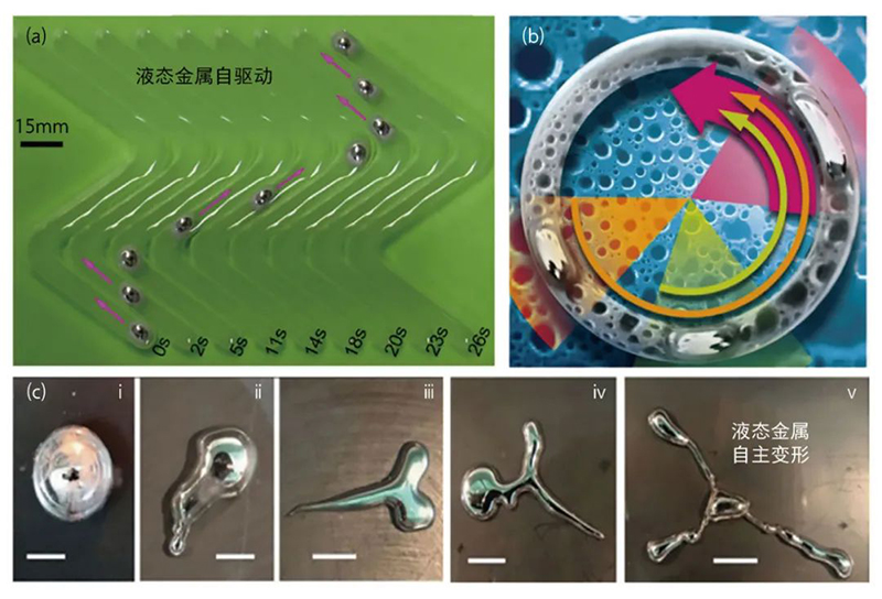 自驅(qū)動(dòng)液態(tài)金屬機(jī)器 (a)單個(gè)液滴自驅(qū)動(dòng)并沿著Z形軌道蜿蜒前行;(b)3個(gè)液態(tài)金屬機(jī)器相互追逐行為,最終融為一體;(c)自驅(qū)動(dòng)液態(tài)金屬自主變形行為,仿佛原生動(dòng)物伸出偽足。