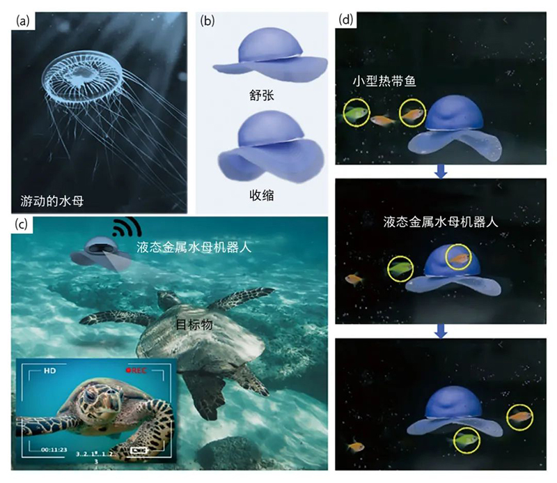 液態(tài)金屬水下機(jī)器人 (a)游動(dòng)的水母;(b)液態(tài)金屬水母機(jī)器人;(c)液態(tài)金屬水母機(jī)器人用于監(jiān)測(cè);(d)液態(tài)金屬水母機(jī)器人運(yùn)動(dòng)輕柔,不會(huì)影響游動(dòng)的小魚。