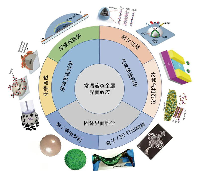 液態(tài)金屬由于同時(shí)兼有金屬性和固有的流體性質(zhì)而表現(xiàn)出迷人的特性,其與不同氣體、液體和固體之間相互作用會(huì)發(fā)生令人驚異的化學(xué)行為 [3],這些基本效應(yīng)的揭示在化學(xué)合成、能量轉(zhuǎn)換、柔性機(jī)器和印刷電子等方面具有重大用途。就如生物需要水分一樣,液態(tài)金屬由于溶液體系的引入,迎來(lái)一系列獨(dú)特機(jī)器效應(yīng)與現(xiàn)象的發(fā)現(xiàn);液態(tài)金屬與特定氣體發(fā)生反應(yīng)形成的薄膜,具有一系列材料效應(yīng)包括半導(dǎo)體效應(yīng);而液態(tài)金屬與各種金屬或非金屬固體發(fā)生合金化或滲透行為,促成了新材料的改性和應(yīng)用。