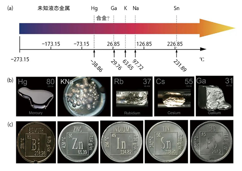 元素周期表中常溫單質(zhì)液態(tài)金屬及其可組成常溫液態(tài)合金的金屬 (a)處于不同溫區(qū)的潛在液態(tài)金屬;(b)常溫液態(tài)金屬;(c)液態(tài)金屬組元。