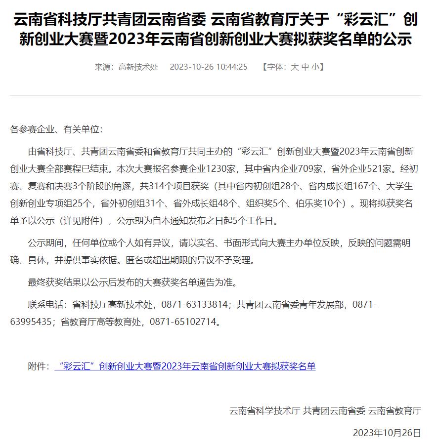 公司獲“彩云匯”創(chuàng)新創(chuàng)業(yè)大賽暨2023年云南省創(chuàng)新創(chuàng)業(yè)大賽三等獎(jiǎng)