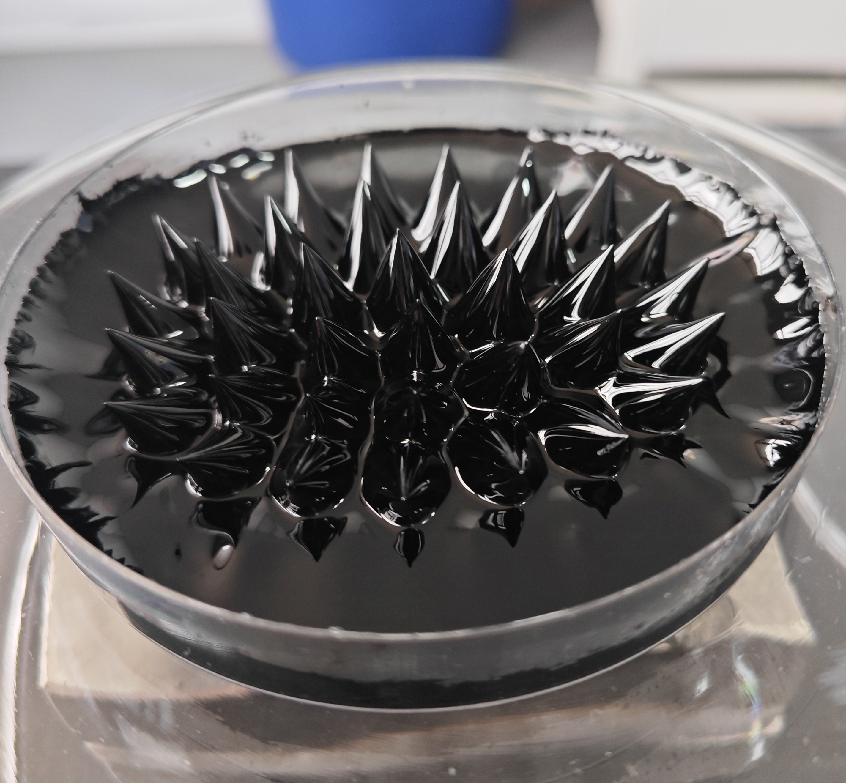磁流體是一種新型的功能材料,它既具有液體的流動(dòng)性又具有固體磁性材料的磁性。是由直徑為納米量級(jí)(10納米以下)的磁性固體顆粒、基載液(也叫媒體)以及界面活性劑三者混合而成的一種穩(wěn)定的膠狀液體。該流體在靜態(tài)時(shí)無磁性吸引力,當(dāng)外加磁場作用時(shí),才表現(xiàn)出磁性。